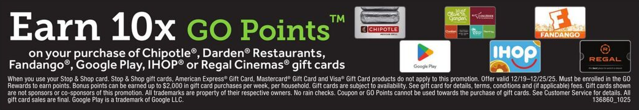 | gift cards for chipotle, darden restaurants, fandango, google play, ihop, or regal cinemas get 10x (10%) go points limit $2000 in gift cards |