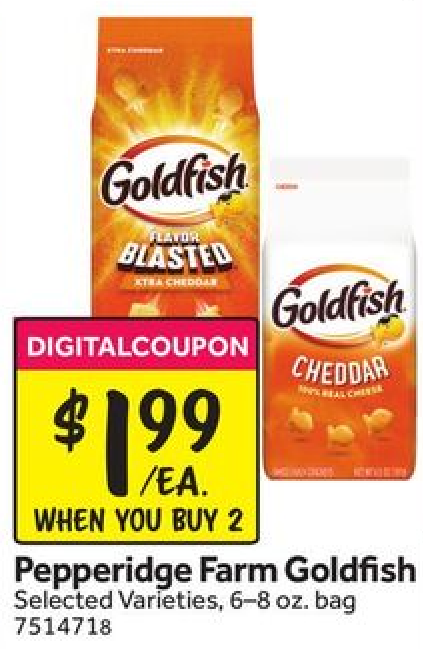 | pepperidge farm goldfish 6–8 oz -$? off 2 digital coupon = $1.99 each wyb 2 |