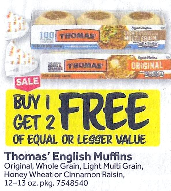 thomas' english muffins 12-13 oz buy 1 get 2 free